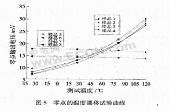 由于芯片對所處環境的要求比較特殊,所以與硅芯片接觸的硅油需要具備以下特點:良好的介電性能、盡可能小的熱脹系數、化學穩定性好以及耐熱和耐寒性能好。硅油的凈化處理是薄膜隔離式壓力傳感器封裝中至關重要的工藝步驟,因為若凈化不干凈,硅油或傳感器受壓部分的充油腔內就會混有氣體、水分等可壓縮、易揮發的物質,在全溫區內的體積變化就會沒有規律可言,造成外界的待測壓力不能準確、規則地傳遞到芯片,從而使得壓力傳感器的溫漂比較嚴重。這種現象反映在零點的溫漂上,可以用來評價封裝的好壞。通常,由于在恒壓源激勵的情況下壓力傳感器的靈敏度溫度系數為負值,所以壓力傳感器的零點稍有下降,如圖5的樣品5,6,7,8所示;而硅油凈化不充分的壓力傳感器零點的溫漂卻非常大,且隨著溫度的升高而升高,如圖5中的樣品1,2,3,4所示。試驗表明,像樣品1,2,3,4這類溫漂很大的傳感器的溫度補償是比較困難的,所以封裝時必須確保硅油品質和填充量恰到好處。