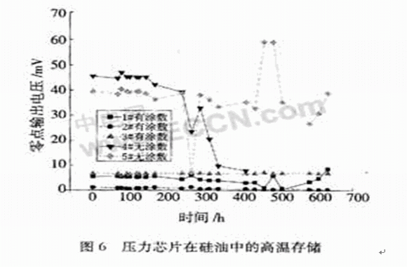 1#,2#,3#涂敷了保護層,4#,5#沒有涂敷保護層。可以看到,沒有保護層的傳感器在高溫下存儲了約200 h后,它的零點突然發生了變化,之后數據不穩定;涂了保護層的壓力傳感器的零點在600多小時后仍然很穩定。因此,為了防止硅油的污染導致壓力傳感器的失效,我們采取了一些必要的措施。首先,選擇高溫下盡可能穩定的硅油;其次,盡量選擇具有良好鈍化層的芯片;最后,在不影響靈敏度的前提下,還可以在封裝過程中對芯片以及引線進行涂敷鈍化層的處理。