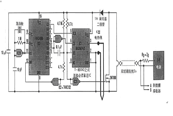 個停止位。11(或13)個數據位包括10(或12)位二進制溫度數據和1位開路熱電偶告警位。晶振保證數據的波特率精度。熱電偶感測接點必須與電路電隔離。必須確保在所有時間內IC1工作在-20℃~85℃溫度范圍內。遠程電源和數據接收器通過雙絞線連接電路。溫度測量IC1內部10位ADC單次轉換實現并在纜線上呈現為串行數據字。(魯)