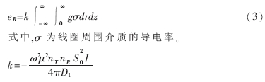 在發(fā)射頻率不高、介質(zhì)導(dǎo)電率較小的條件下,可忽略電磁波傳播效應(yīng)和渦流損耗,用幾何因子理論對接收線圈中的二次感應(yīng)電動勢進(jìn)行計(jì)算,將同軸于z的兩線圈周圍介質(zhì)中的感應(yīng)渦流分割成以探頭軸心為圓心、半徑為r、距線圈T和R距離分別為ρT和ρR的小單元環(huán)電流。將探頭周圍介質(zhì)看作是均勻無限介質(zhì),把所有的單元環(huán)感生的電動勢疊加在一起得到: