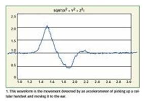 圖1:圖中波形是檢測拿起手機并送到耳邊這個動作的加速計所測到的姿態運動。