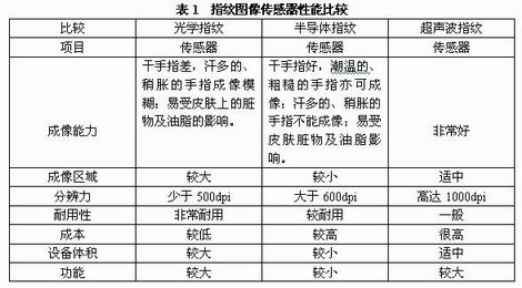 為克服物理方式的缺點(diǎn),開發(fā)的光學(xué)傳感器、半導(dǎo)體傳感器、超聲波傳感器等對獲取高質(zhì)量指紋圖 像提供了良好的技術(shù)保障,具有很好實(shí)用價值。同時,更先進(jìn)的指紋圖像傳感器亦在研發(fā),目的是獲得足夠的指紋細(xì)節(jié),并使指紋圖像達(dá)到較高分辨力,提高指紋識 別準(zhǔn)確性、可靠性。本文主要介紹各種指紋圖像傳感器技術(shù)關(guān)鍵、性能特點(diǎn),并簡要介紹其應(yīng)用情況及發(fā)展趨勢。