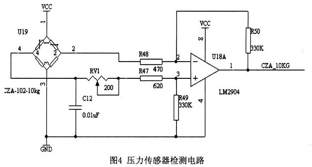 圖4為壓力傳感器的應用電路圖,該電路采用的電橋構成測量電壓,是一種具有較高靈敏度的測量方法。無差壓時,電橋兩臂平等。差壓信號加到4個陶瓷壓敏電阻上,壓敏電阻的阻值隨差壓而變化,引起電橋失衡。電橋失衡引起電流的變化,通過運放LM2904進行電流的放大在后面接ADC0834模數(shù)轉換芯片,把模擬信號轉化為數(shù)字信號,再傳輸至CPU進行處理。