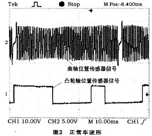故障分析與測(cè)試采用雙蹤示波器同時(shí)測(cè)量故障車上曲軸位置傳感器與凸輪軸位置傳感器的波形如圖1所示,在同類型的正常車上測(cè)得的凸輪軸位置傳感器和曲軸位置傳感器波形如圖2所示。