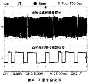 通過圖4還能看出曲軸位置傳感器波形出現(xiàn)2次才與凸輪軸位置傳感器波形重合一次起始位置,這種關(guān)系和本車曲軸轉(zhuǎn)速與凸輪軸轉(zhuǎn)速比為2:1的關(guān)系一致,也正好是1缸上止點(diǎn)的位置,也就是1缸點(diǎn)火正時(shí)的基準(zhǔn)位置,也決定了其它3個(gè)缸的點(diǎn)火時(shí)刻。此信號(hào)傳輸給腳,ECU就能發(fā)出點(diǎn)火信號(hào),起動(dòng)發(fā)動(dòng)機(jī)。否則ECU就不發(fā)出點(diǎn)火信號(hào),發(fā)動(dòng)機(jī)不能起動(dòng)。