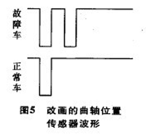 故障總結(jié)為什么此車會(huì)出現(xiàn)間歇性起動(dòng)困難的現(xiàn)象?再來看一下圖1與圖2中曲軸位置傳感器的波形,假如在圖1中曲軸位置傳感器波形最上方向下一點(diǎn)的位置畫一橫線,又在圖2中曲軸位置傳感器波形上同樣位置畫一橫線,根據(jù)在此線上有無波形可得出圖5中的2個(gè)波形,ECU只有得到圖5下圖波形才能發(fā)出點(diǎn)火信號(hào)起動(dòng)發(fā)動(dòng)機(jī),而ECU得到圖5上的波形不能發(fā)出點(diǎn)火信號(hào)起動(dòng)發(fā)動(dòng)機(jī),但在偶然的時(shí)刻故障位置產(chǎn)生的波形恰好達(dá)到合格的底線時(shí),就可以起動(dòng)發(fā)動(dòng)機(jī)。起動(dòng)后,ECU對(duì)曲軸位置傳感器波形的檢測(cè)就不是那么嚴(yán)了,因此,發(fā)動(dòng)機(jī)起動(dòng)后不會(huì)熄火。也就是此車故障的根本原因。