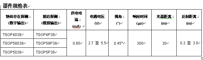 很多其他應(yīng)用要求反射傳感器不僅能夠探測是否有光,還要能通過測量反射信號的強弱程度判定物體的遠(yuǎn)近。除了不能采用固定的探測閾值,還需要來自傳感器的模擬信息。利用TSOP4P38、TSOP5P38和TSOP58P38紅外接近傳感器,可滿足這些要求。傳感器輸出脈沖的長度根據(jù)發(fā)射器信號做出響應(yīng),發(fā)射器信號會按照反射自被探測物體的光的數(shù)量成比例變化。對于近處的物體,輸出脈沖接近發(fā)射脈沖的100%,對于遠(yuǎn)處的物體,輸出脈沖會變得更短。