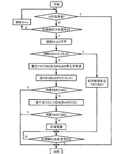 在MCU讀TAG-IT期間,由S6700掌握時(shí)鐘線控制權(quán)。S6700讀得數(shù)據(jù)后,通過(guò)DIN傳輸給MCU。在讀取數(shù)據(jù)時(shí),MCU必須嚴(yán)格模擬TAG-IT的響應(yīng)時(shí)序,并通過(guò)傳輸來(lái)的FLAG來(lái)確定數(shù)據(jù)的正確性。只有在FLAG完全正確時(shí),才會(huì)繼續(xù)接受響應(yīng)內(nèi)容,否則,系統(tǒng)將結(jié)束讀卡過(guò)程。圖5給出了讀應(yīng)答器的子程序圖。