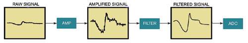 圖2,傳感器的信號(hào)路徑中包括放大器、濾波器和ADC。濾波器的設(shè)計(jì)用于去除信號(hào)中的噪聲,限制帶寬。
