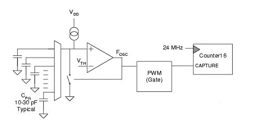 該比較器的輸出被作為一個(gè)脈沖寬度調(diào)制器(PWM)電路的時(shí)鐘輸入信號(hào),它負(fù)責(zé)選通一個(gè)頻率為24兆赫茲的16位計(jì)數(shù)器。手指接觸傳感器時(shí)會(huì)增加電容,從而增加計(jì)數(shù)器的總值。這就是一個(gè)手指如何被感覺到方式。這個(gè)系統(tǒng)的典型波形如圖4所示