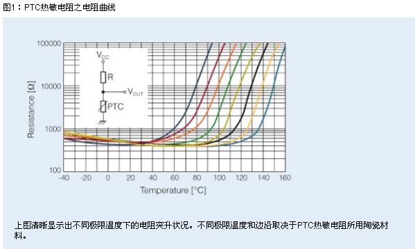 PTC熱敏電阻具有非線性特性:在低溫例如環境溫度條件下,其電阻較低。隨著溫度的升高,其電阻基于所用陶瓷材料將會突升。這一閾值又稱作參考溫度或極限溫度。圖1所示為PTC熱敏電阻典型特性。