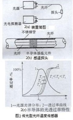 位圖2(a)為半導體吸光型(傳光型)光纖溫度傳感器示意圖。將一根切斷的光導纖維裝在細鋼管內,光纖兩端面間夾有一塊半導體感溫薄片(如GaAs或InP),這種半導體感溫薄片透射光強隨被測溫度而變化。因此,當光纖一端輸入一恒定光強的光時,由于半導體感溫薄片透射能力隨溫度變化,光纖另一端接收元件所接受的光強也隨被測溫度而改變。于是通過測量光探測器輸出的電量,便能遙測到感溫探頭2(b)處的溫度。