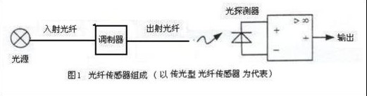 光纖傳感器一般是由光源、接口、光導纖維、光調制機構、光電探測器和信號處理系統等部分組成。來自光源的光線,通過接口進入光纖,然后將檢測的參數調制成幅度、相位、色彩或偏振信息,最后利用微處理器進行信息處理。概括光纖傳感器一般由三部分組成,除光纖之外,還必須有光源和光探測器兩個重要部件,見圖1所示。