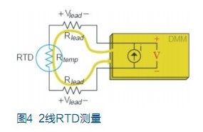 與熱敏電阻相似,鉑電阻溫度傳感器(RTD)也是用鉑制成的熱敏感電阻。當通過測量電壓計算RTD 溫度時,數(shù)字萬用表用已知電流源測量該電流源所產(chǎn)生的電壓。這一電壓為兩條引線(Vlead)上的壓降加RTD上的電壓(Vtemp)。例如,常用RTD 的電阻為100Ω,每1℃僅產(chǎn)生0.385Ω的電阻變化。如果每條引線有10Ω電阻,就將造成26℃的測量誤差,這是不可接受的。所以應對RTD作4線歐姆測量。