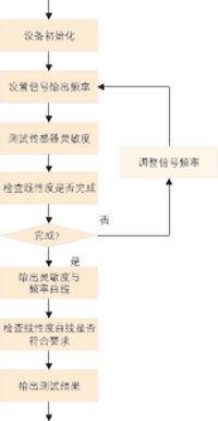 壓電式爆震傳感器的線性度檢測主要通過連續改變振臺的振動頻率,即采用掃頻的方式,將振臺的振動加速度穩定在設定范圍內,對各個頻率下的傳感器靈敏度進行檢測,輸出各個靈敏度與頻率相對應的連續曲線,并檢測該曲線是否符合該傳感器產品的線性度要求,其測試流程如圖1所示。