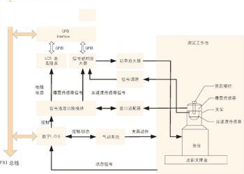 為保證汽車爆震傳感器測試系統的可靠性、高效性和可擴展性,在硬件組成上采用PXI系統實現對整個系統的控制,硬件資源與系統構成如圖2所示,主要包括PXI控制器、PXI數字I/O板卡、振臺、LCR表、高阻表、信號鎖相放大器、信號通道切換模塊和氣動夾具系統等。