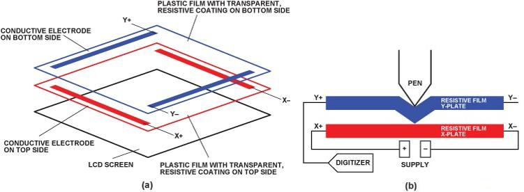 連接直流電壓的層稱為“有源”層,電流與其阻抗成反比。測量電壓的層稱為“無源”層,無相關電流流經該層。發生單點觸摸時,在有源層中形成一個分壓器,無源層電壓測量通過一個模數轉換器讀取與觸摸點和負電極之間的距離成比例的電壓1.