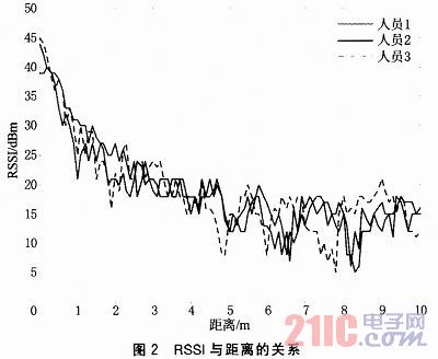由圖2可以看出,不同的人員拿著移動(dòng)終端前進(jìn),RSSI與距離的關(guān)系曲線基本一致,說(shuō)明RSSI值與距離的關(guān)系符合一定的衰減規(guī)律。