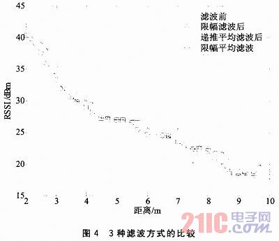 紅外線、GPS和超聲測(cè)距都需要額外的硬件,增加了節(jié)點(diǎn)的硬件成本和尺寸。GPS和紅外線測(cè)距誤差較大,而利用超聲方法測(cè)距很精確,測(cè)距誤差只有10 cm,但是受氣溫、濕度等的影響較大,不適合在室外使用。基于RSSI的定位無(wú)需額外硬件,利用對(duì)接收無(wú)線信號(hào)的強(qiáng)度判斷,推導(dǎo)收發(fā)節(jié)點(diǎn)間的距離,計(jì)算接收無(wú)線信號(hào)強(qiáng)度是商用無(wú)線收發(fā)芯片具備的功能。基于RSSI的測(cè)距提供了最廉價(jià)的定位方法,而且節(jié)點(diǎn)沒(méi)有添加任何部件。基于超聲的測(cè)距雖然定位精度較高,但是需要添加硬件、增加節(jié)點(diǎn)成本和尺寸。所以,基于RSSI的測(cè)距是無(wú)線傳感器網(wǎng)絡(luò)定位較常采用的方法。首先對(duì)RSSI進(jìn)行預(yù)處理,再通過(guò)預(yù)測(cè)模型預(yù)測(cè)距離的值,不但提高了基于RSSI的測(cè)距精度,而且實(shí)現(xiàn)了低成本的測(cè)距。