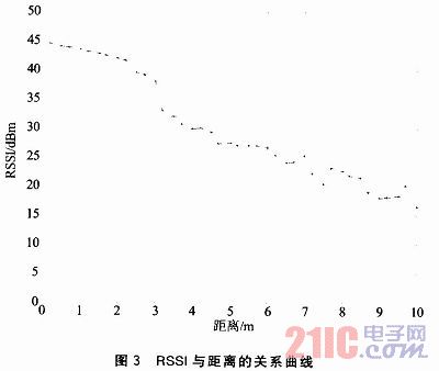 在相同的實(shí)驗(yàn)平臺(tái)下,在0~10 m的范圍內(nèi),每間隔0.2 m或者0.3 m記錄RSSI值,每個(gè)距離均接收100個(gè)左右的數(shù)據(jù)包,對(duì)RSSI先進(jìn)行均值處理,然后得出RSSI值與距離的關(guān)系曲線如圖3所示。