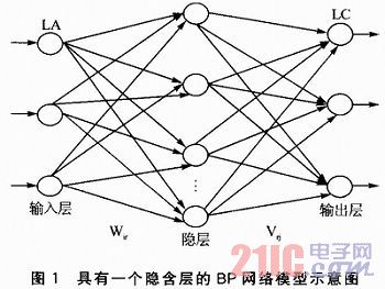 BP網(wǎng)絡(luò)是神經(jīng)網(wǎng)絡(luò)中采用誤差反傳算法作為其學(xué)習(xí)算法的前饋網(wǎng)絡(luò),通常由輸入層、輸出層和隱含層(一層或多層)構(gòu)成。層與層之間的神經(jīng)元采用全互連的連接方式,通過(guò)相應(yīng)的網(wǎng)絡(luò)權(quán)系數(shù)w相互聯(lián)系,每層內(nèi)的神經(jīng)元之間沒(méi)有連接。圖1所示為具有一個(gè)隱含層的BP網(wǎng)絡(luò)模型。其中:LA為BP神經(jīng)網(wǎng)絡(luò)的輸入層,LB為隱層,LC為輸出層,Wir為隱層與輸入層的權(quán)值,Vrj為輸出層與隱層的權(quán)值。