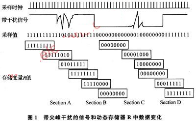 從單片機計數輸入端,觀察信號波形。為便于分析,在高、低電平段設置了幾個干擾尖峰脈沖,分別標示為Section A和Section C,占空比信號下降沿、上升沿分別標示為Section B和Section D。單片機按計數時鐘周期性采樣,采樣值中“1”表示采到的是高電平,“0”表示低電平。I/O口采樣占空比信號輸出端口中狀態,利用1個字節型變量R來動態存儲采樣值。控制器每采樣1次,變量R中數據向左移1個二進制位,R原最高位電平狀態被移除,而當前時刻新的采樣狀態保存到R的最低位,變量R被更新了,狀態存儲器R中保存著最近8個采樣周期的采樣值。