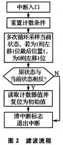 根據軟件濾波設計思想,濾波子程序由主程序在信號狀態發生變化,進入中斷時調用,圖2給出了濾波程序流程。對照圖1中4種Section來分析流程圖。當有邊沿或干擾信號(信號周期大于計數時鐘周期)到來時,VRS51L3074單片機的PWC計數停止條件滿足,系統進入中斷服務子程序。在中斷子程序中,首先重置脈寬計數條件,然后對當前狀態進行采樣,采樣1次,狀態寄存器左移1位,采樣到高電平記為“1”,采樣到低電平記為“0”。如正常下降沿Section B,前面處于高電平段,初始狀態變量Flag全為1,當出現低電平,控制器進人中斷,緊接著進行16次采樣。前已提及系統處理的尖峰干擾約1~2 ms,每個采樣周期約為0.4 ms,其尖峰干擾脈寬達不到8個采樣周期。系統設計時采樣16次,只取最后8次的存儲狀態與原狀態進行比較,如果最后采樣的狀態全為“0”則與原狀態相反,就可判斷出這是1個正常下降沿。如果是干擾信號引起計數中斷,前面8個采樣狀態不全為“1”,后面8個狀態全為“1”,最后采樣的狀態與原狀態相同,就可判斷出這是1個干擾信號,如Section A。在信號狀態采樣期間,計數條件滿足PWC繼續計數,直到真正的下降沿到來,計數停止并保存,計數寄存器還原為初始值,這樣干擾信號即被濾除。類似地,正常上升沿Section D,存儲器原狀態為“0”,上升沿來臨后存儲器狀態為“1”,與原狀態相反,PWC計數停止并保存,計數寄存器還原為初始值,退出中斷子程序。有干擾信號出現后采樣狀態與原狀態相同,干擾尖峰脈沖可被濾除。如果要使脈寬計數更精確,可判斷前8個采樣周期中系統不正常計數的周期,然后與最終計數周期相加即可。此時,程序流程體現出軟件濾波功能。