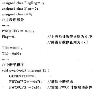 VRS51L3074單片機是由美國Ramtron(瑞創)公司推出的8位單片機家族VRS51L3XXX系列的成員。VRSS1L3074提供了2個與定時器0和1關連的獨立的脈寬計數器(PWC)模塊,用戶可通過對PWC模塊和定時器的配置,靈活地控制定時器啟動或停止計數,從而方便地實現對ADXL202E輸出的脈寬和周期的計數。