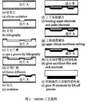 硅電容式壓力傳感器的敏感元件是半導(dǎo)體薄膜,它可以由單晶硅、多晶硅等利用半導(dǎo)體工藝制作而成。典型的電容式傳感器由上下電極、絕緣體和襯底構(gòu)成。當(dāng)薄膜受壓力作用時(shí),薄膜會(huì)發(fā)生一定的變形,因此,上下電極之間的距離發(fā)生一定的變化,從而使電容發(fā)生變化。但電容式壓力傳感器的電容與上下電極之間的距離的關(guān)系是非線性關(guān)系,因此,要用具有補(bǔ)償功能的測量電路對輸出電容進(jìn)行非線性補(bǔ)償。由于高溫壓力傳感器工作在高溫環(huán)境下,補(bǔ)償電路會(huì)受到環(huán)境溫度的影響,從而產(chǎn)生較大的誤差。基于模型識(shí)別的高溫壓力傳感器,正是為了避免補(bǔ)償電路在高溫環(huán)境下工作產(chǎn)生較大誤差而設(shè)計(jì)的,其設(shè)計(jì)方案是把傳感器件與放大電路分離,通過模型識(shí)別來得到所測環(huán)境的壓力。高溫工作區(qū)溫度可達(dá)350℃。傳感器件由鉑電阻和電容式壓力傳感器構(gòu)成。其MEMS工藝如下: