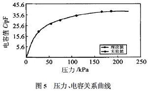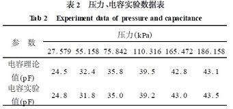 1可見,擬合的電容誤差小于1%。由此可見,在不同的時(shí)刻測得UO(t),通過曲線擬合得出參數(shù)RC。再給電路加小信號直流電源,測出R值,即求得C,通過C值則可知被測環(huán)境的壓力。圖5為350℃時(shí),不同的壓力所對應(yīng)的電容的理論值和實(shí)驗(yàn)值,從實(shí)驗(yàn)數(shù)據(jù)(表2)可得,在測壓的過程中,利用模型識(shí)別的方法,誤差較小,其測壓誤差小于2%。