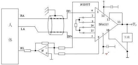 圖1是INA115在心電檢測電路中的實用電路。放大器的正負輸入通過心電傳感器分別接到人體的左臂(LA)與右臂(RA)上,與運放N和電阻R1~R4組成的驅動網絡接到人體的右腿(RL)上,構成“浮地”。由于生物信號很弱,加之有極化電位,所以該級的放大倍數不宜太高,一般取在10~100之間,并且只能作為前置放大用,為了檢測安全,后級一般應再采用隔離放大電路進行隔離,且該級的電源電壓最好應采用隔離電源模塊進行提供,以達到電源及信號的完全隔離。如圖2所示,
