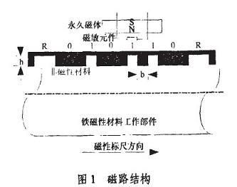 采用圖1所示的測(cè)量結(jié)構(gòu),其中被測(cè)工作部件要求屬于鐵磁性材料。文獻(xiàn)中指出在固定的磁場(chǎng)中,表面變化的曲率越大,引起的周?chē)艌?chǎng),變化也越大。為了使磁場(chǎng)的影響最大,選用凹槽作為測(cè)罩標(biāo)志,以單位寬度(bmm)的凹槽表示“0”或碼元間隔,單能寬度的“凸槽”表示“1”,兩倍單位寬度的“凸槽”表示標(biāo)志位R。在工作部件表面,按上述的編碼規(guī)則加下出一系列凹槽,然后噴涂上非磁性材料,形成磁性標(biāo)尺。圖1所示的磁性標(biāo)尺表示Gray碼01 1010碼區(qū),黑色部分表示非磁性材料。