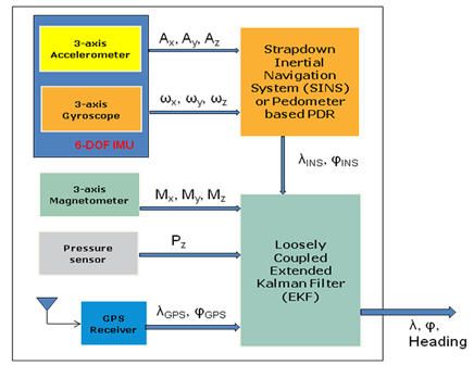 當天線沒有被遮擋時,現(xiàn)代的GPS接收器的絕對定位精度是3米到20米,這個參數(shù)不會在一段時期后發(fā)生漂移。基于MEMS傳感器的捷聯(lián)式慣性導航系統(tǒng)(SINS) 可在很短的時間內(nèi)提供精確的定位信息,但是,根據(jù)運動傳感器的性能,這種導航系統(tǒng)在使用一段時間后很快就會發(fā)生精度漂移現(xiàn)象。行人航位推算系統(tǒng)(PDR)是一個根據(jù)步長和方位計算從室內(nèi)已知初始位置開始的行走距離的相對導航系統(tǒng),雖然定位精度不會隨時間推移而發(fā)生漂移,但是需要在受磁力干擾的環(huán)境內(nèi)保持航向精度,此外,GPS需要對步長進行校準,才能達到可以接受的定位精度。
