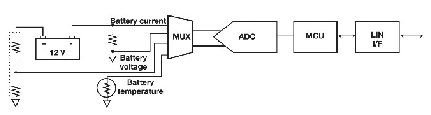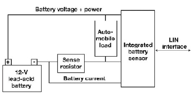 電池電壓通過一個直接從電池正極分接出來的阻性衰減器來檢測。為檢測電流,將一個檢測電阻(12V應用一般使用100mΩ)放在電池負極與地之間。在這種配置中,汽車的金屬底盤一般為地,檢測電阻安裝在電池的電流回路中。在其它配置中,電池的負極是地。對于SoH 計算,還必須檢測電池的溫度。