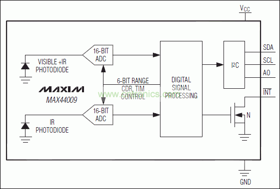 MAX44009采用Maxim公司專有的BiCMOS技術設計,在2mm x 2mm x 0.6mm微型封裝內集成了兩個光傳感器、一個ADC和所有必備的數字功能。這種集成特性能夠在提供業內最佳性能的同時,節省寶貴的電路板空間。