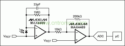 圖2所示為分立光電二極管電路,從圖中可以看出,該電路需要一個或多個運算放大器:一個用于電流到電壓的轉換,可能還需要一級放大,提供附加增益。它還包括一些分支電路,用于供電,確保高度可靠的信號鏈。而在空間極其寶貴的應用中,所需元件的數量過多可能導致空間受限問題。