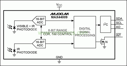 圖4提供了MAX44009的功能框圖,采用I²C通信協議,使其與微控制器的連接方式更簡單,數據傳輸速度更快。除此之外,該解決方案的高集成特性使其能夠置于柔性電纜,安裝在離主電路板距離合適的位置。