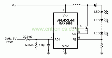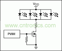 許多顯示屏模塊如今都配有一個集成控制器,用戶可以通過向控制器發送串行命令,直接設置背光亮度。如果顯示屏模塊未配備集成控制器,還可安裝一個簡單的背光控制執行器,控制顯示屏后面用于背光照明的白光LED燈的輸入電流。實現這種控制的一種簡單辦法是:直接給LED串聯一個場效應晶體管(FET),使用PWM信號快速打開、關閉FET (圖5)。然而,也可以利用單一芯片(用于LED控制的MAX1698升壓轉換器)準確、可靠地調節(圖6),請參考應用筆記3866“Low-power PWM output controls LED brightness”,獲取詳細信息。