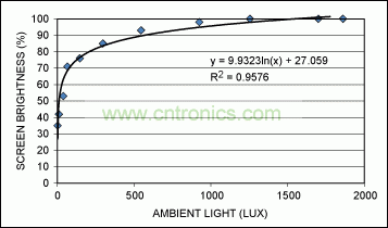 最后一步就是在傳感器和執行器之間建立連接,通過微控制器實現。有人可能首先要問:“環境光強如何映射到背光亮度?”事實上,有些文獻專門介紹了相關方案。其中一種映射方式是,Microsoft®針對運行Windows® 7¹操作系統的計算機提出的。圖7所示曲線是由Microsoft提供的,它可以將環境光強度映射到顯示屏亮度(以全部亮度的百分比表示)。