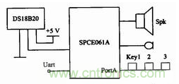 綜上所述,整體硬件電路組成如圖1所示,由SCPE061A單片機(jī)實(shí)現(xiàn)系統(tǒng)整體控制并實(shí)現(xiàn)語(yǔ)音或鍵盤(pán)編程與語(yǔ)音播報(bào),系統(tǒng)可通過(guò)通用異步串行接口實(shí)現(xiàn)聯(lián)網(wǎng)功能,在不需要聯(lián)網(wǎng)的場(chǎng)合,溫度計(jì)也可以單獨(dú)使用,實(shí)現(xiàn)了系統(tǒng)的可裁剪,DSl8B20用來(lái)實(shí)現(xiàn)溫度檢測(cè)。