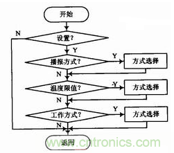 可設(shè)置的參數(shù)主要有,播報(bào)方式:“連續(xù)、隔x秒、禁止”;報(bào)警溫度值;工作方式等。在需要實(shí)時(shí)關(guān)注溫度值的時(shí)候,可以設(shè)置為連續(xù)播報(bào);溫度變化較慢的時(shí)候可以設(shè)置為隔x秒方式;夜晚設(shè)置報(bào)警模式后,可以設(shè)置為禁止播報(bào)模式。設(shè)置報(bào)警溫度值后可以,可以處理其他事情,在出現(xiàn)警情時(shí),系統(tǒng)給出報(bào)警,提示用戶(hù)。選擇工作方式為“聯(lián)網(wǎng)工作”后,系統(tǒng)除了現(xiàn)場(chǎng)播報(bào)和報(bào)警外,還將相應(yīng)信息通過(guò)異步串行口發(fā)送到遠(yuǎn)端。設(shè)置過(guò)程全部采用語(yǔ)音菜單方式,可以大幅度較低成本,設(shè)置流程圖如圖2所示。