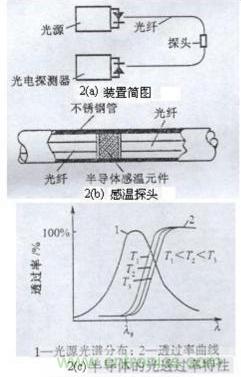 位圖2(a)為半導體吸光型(傳光型)光纖溫度傳感器示意圖。將一根切斷的光導纖維裝在細鋼管內,光纖兩端面間夾有一塊半導體感溫薄片(如GaAs或InP),這種半導體感溫薄片透射光強隨被測溫度而變化。因此,當光纖一端輸入一恒定光強的光時,由于半導體感溫薄片透射能力隨溫度變化,光纖另一端接收元件所接受的光強也隨被測溫度而改變。于是通過測量光探測器輸出的電量,便能遙測到感溫探頭2(b)處的溫度。