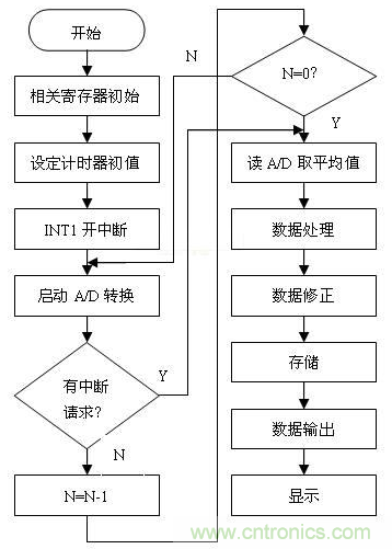 檢測處理程序流程框圖如圖4所示。采用MCS系列匯編語言〔5〕編程,由于有硬件設計的保證,使得整個系統(tǒng)既可以工作在循環(huán)查詢的方式,也可工作在中斷管理的方式。