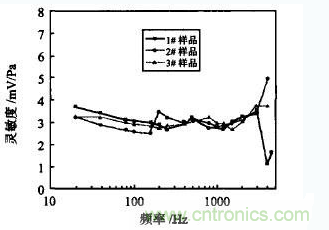 樣品采用北京信息工程學院研制的YLC-A型壓電式微壓傳感器,樣品數為3只。將傳感器安裝在測試腔蓋樣品架上,輸出端與腔蓋上的樣品輸出引線連接,扣緊腔蓋,按圖1所示連接系統。由于傳感器內裝前置放大器,需提供直流電源工作,電源加在腔蓋上被測傳感器輸出端。調節信號發生器產生正弦信號,信號幅度不宜過大,以避免傳感器輸出失真。取多個信號頻率,分別測量每個頻率點兩傳感器的輸出電壓,在1kHz處示波器上的標準傳感器波形(1)的峰-峰值電壓為145.5mV;被測傳感器波形(2)的峰峰值電壓為5.85V。將V標和V測代入式(1)算出被測傳感器的靈敏度。根據計算結果繪制傳感器的靈敏度隨頻率變化曲線,如圖2所示,得到傳感器的頻率響應范圍。