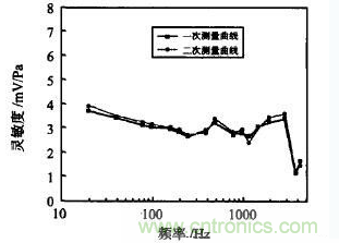 為檢測測量系統的重復性,實驗對1#傳感器進行了重復測量,圖3示出2次測量的靈敏度變化曲線。
