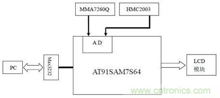 本系統的硬件結構如圖2所示。由于At91sam7s64具有片上A/D轉換器而且具有8選1模擬復用器,使得MMA7620Q和HMC2003可以直接與微控制器相連而不必外加A/D轉換器和復用器,不僅降低了系統的成本和體積,提高了系統的集成度,同時減少了誤差源,提高了精度。經過A/D轉換的測量數據經過ARM核的處理后,被送到串口LCD并通過RS232接口送入PC機進行進一步的分析。