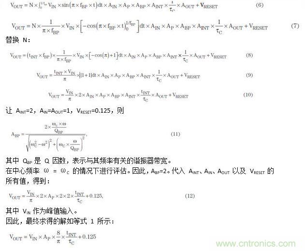 積分器工作從0到B執行N次。這將覆蓋輸入的正極。全波整流隨后可通過其它增益系數進行補償。替換VIN,從0到1/fBP積分。