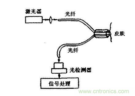 2、血流速度測量多普勒型光纖速度傳感器測量皮下組織血流速度的示意見圖4此裝置利用了光纖的端面反射現象,測量系統結構簡單。
