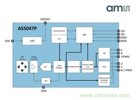 另外,AS5047P的標(biāo)準(zhǔn)4線SPI串行接口能讓主微控制器讀取AS5047P內(nèi)的14位絕對(duì)角度位置數(shù)據(jù),無需專門的編程器也能對(duì)非易失性設(shè)置進(jìn)行編程。該器件還能同時(shí)提供標(biāo)準(zhǔn)UVW換向接口用于無刷直流電機(jī),無需單獨(dú)的霍爾傳感器開關(guān),提供單IC以支持電機(jī)定位與控制應(yīng)用。而PWM編碼輸出信號(hào)則可以提供絕對(duì)角度位置信息。