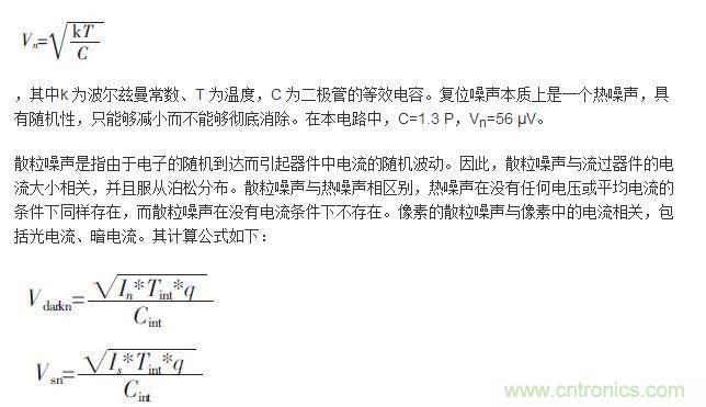 光電流散粒噪聲與照度有關(guān),很難消除。與暗電流有關(guān)的散粒噪聲可以通過(guò)改變摻雜濃度減小暗電流,但這會(huì)降低量子效率。在本電路中,In=100 fA,Is=20 pA,Tint=20 μs,C int =2 fF,則Vdarkn=0.28 mV,Vsn=4 mV。